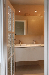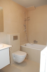 - Badkamer (*) met dubbele lavabo, WC, bad met douche. Betegelde muren.